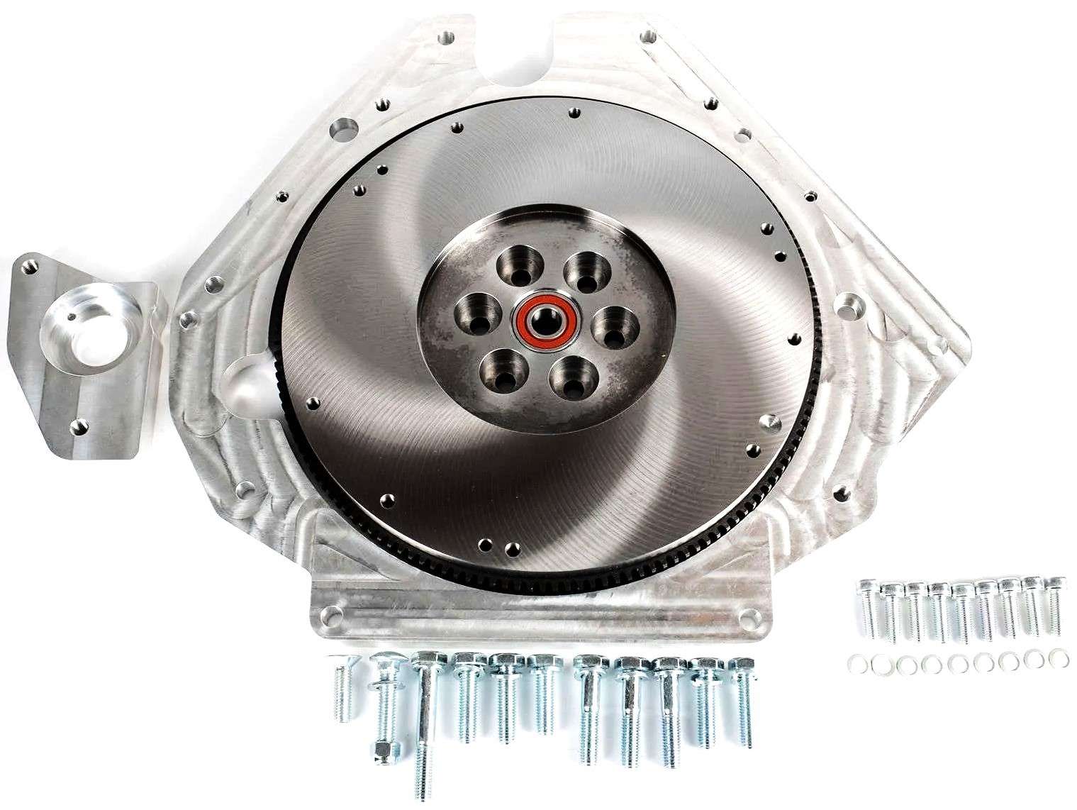 Flywheel (inc ring gear, pilot bearing, and dowels), Adapter Plate, Starter Mount, Motor Mounts, Motor Mount Plates, Transmission Mounts, and Hardware